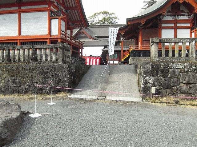 漆塗りの神殿は,宝暦6年(1756年)島津重豪(しまづしげひで)公により再建され,本殿は鹿児島県内最大の木造建築物で、県指定有形文化財となっています。
